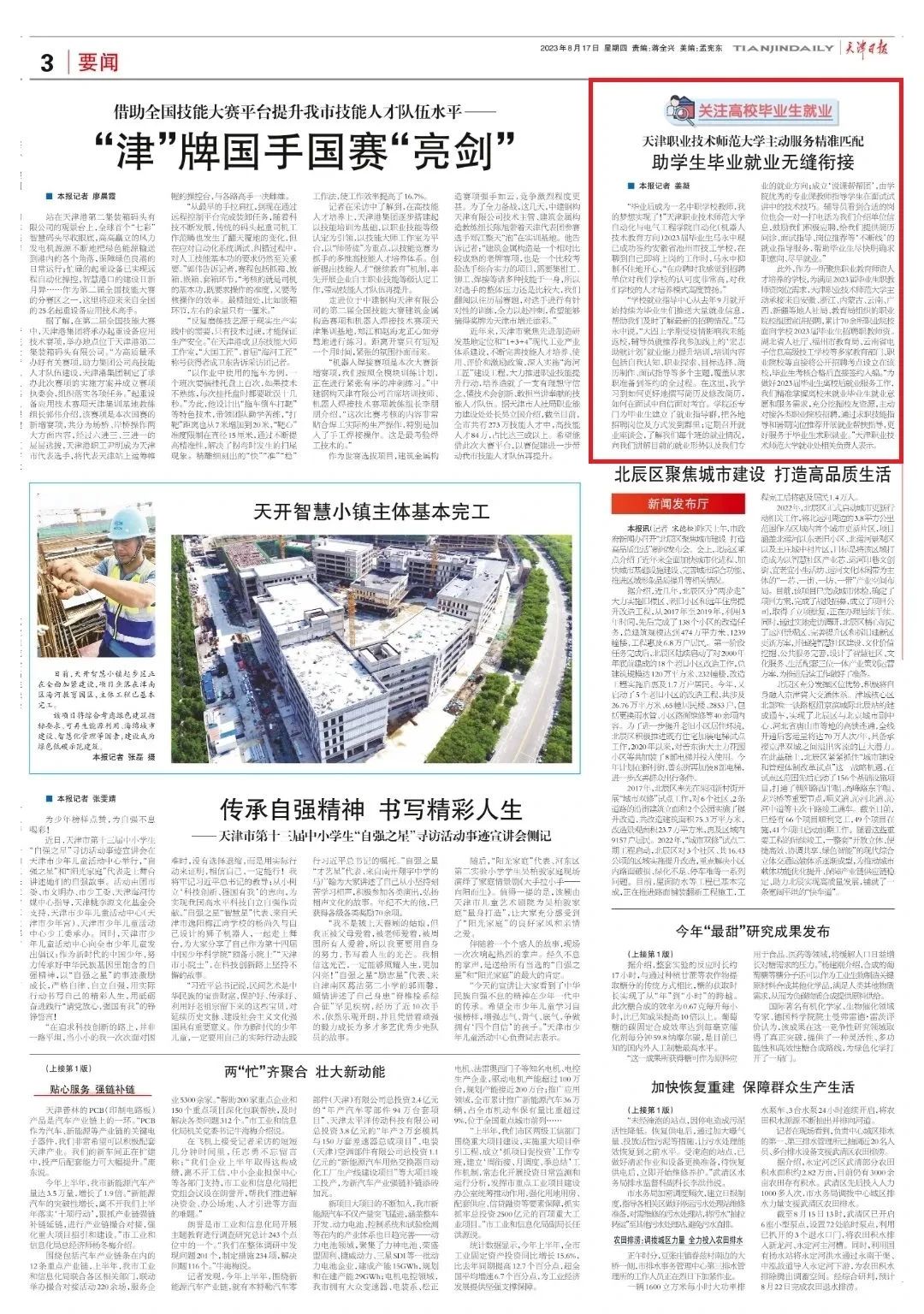 8月17日,《天津日报》以“助学生毕业就业无缝衔接”为题报道我校主动服务、精准匹配,助力毕业生高质量就业。